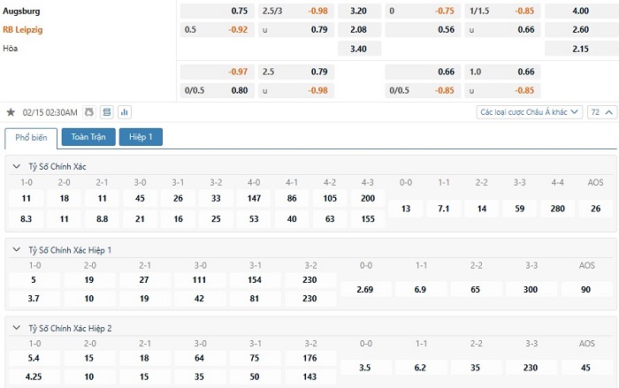 Bảng tỷ lệ kèo bóng đá trận đấu Augsburg vs RB Leipzig