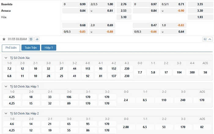 Bảng tỷ lệ kèo bóng đá trận đấu Boavista vs Arouca