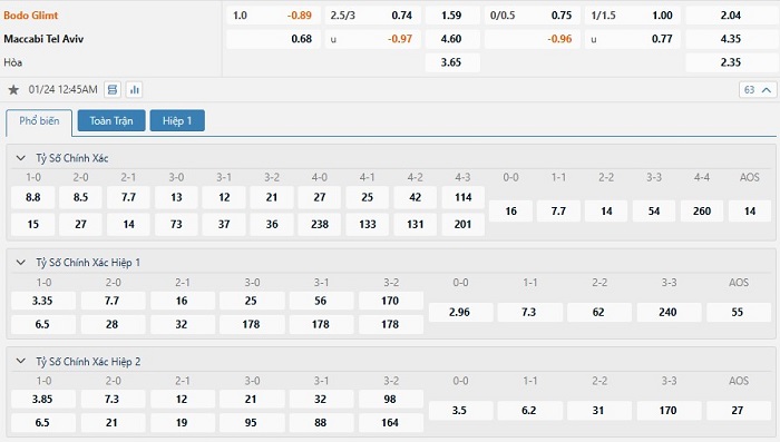 Bảng tỷ lệ kèo bóng đá trận đấu Bodo Glimt vs Maccabi Tel Aviv