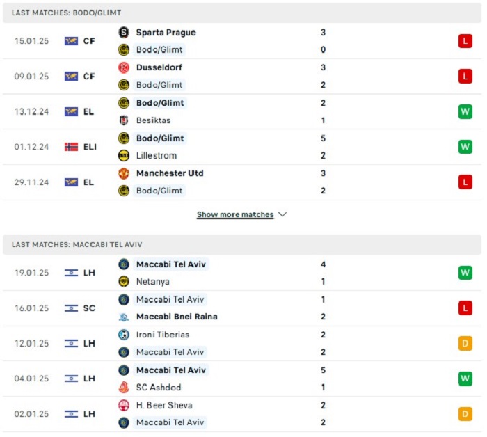 Phong độ gần đây Bodo Glimt vs Maccabi Tel Aviv