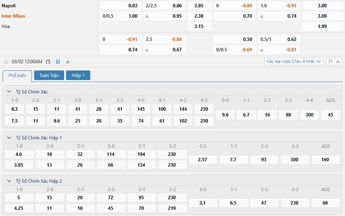 Bảng tỷ lệ kèo bóng đá trận đấu Napoli vs Inter Milan