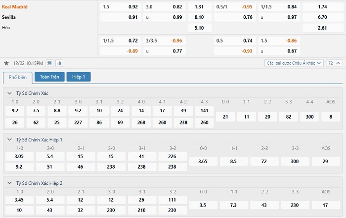 Bảng tỷ lệ kèo bóng đá trận đấu Real Madrid vs Sevilla