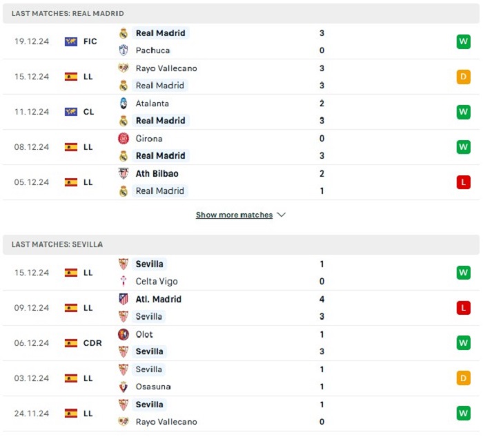 Phong độ gần đây Real Madrid vs Sevilla