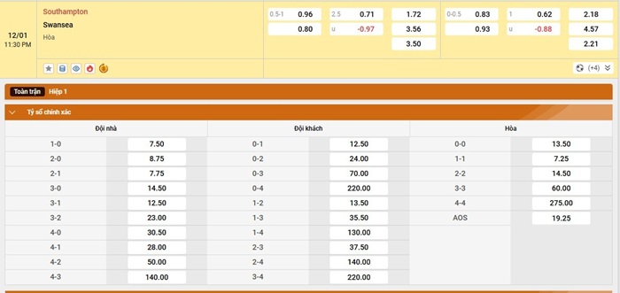 Bảng tỷ lệ kèo bóng đá trận đấu Southampton vs Swansea