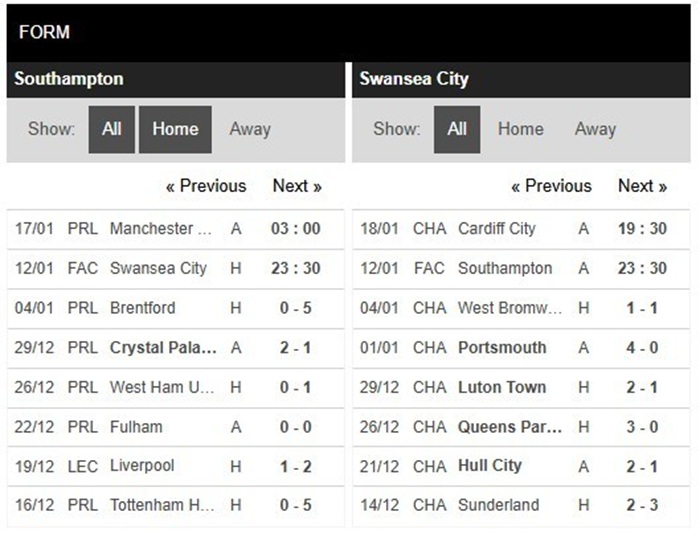 Xét trên khía cạnh thành tích đối đầu, Southampton cho thấy rõ sự áp đảo của mình khi họ đem về tới 7 chiến thắng trong 10 lần gần nhất gặp mặt Swansea. Chính vì thế, không có gì ngạc nhiên khi dù cho phong độ của đội chủ nhà Southampton thời gian qua vô cùng kém cỏi nhưng đội ngũ chuyên môn vẫn tin rằng chiến thắng sẽ thuộc về tay đại diện đang chơi ở giải Ngoại hạng Anh.