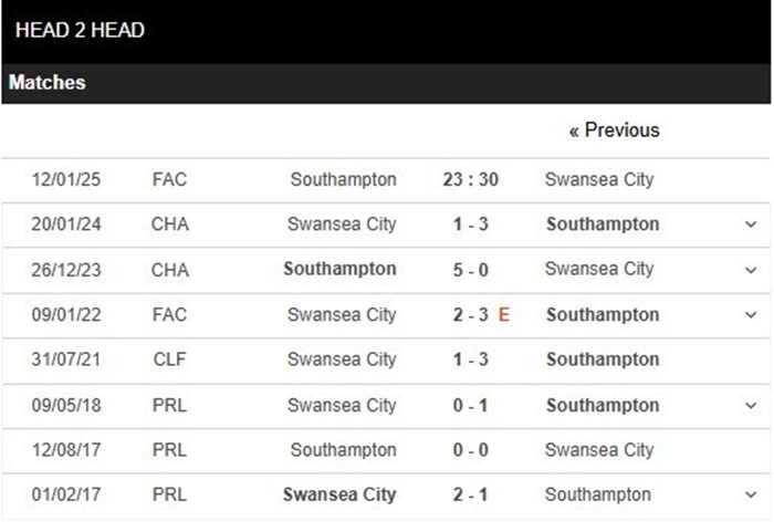 Lịch sử đối đầu của Southampton vs Swansea