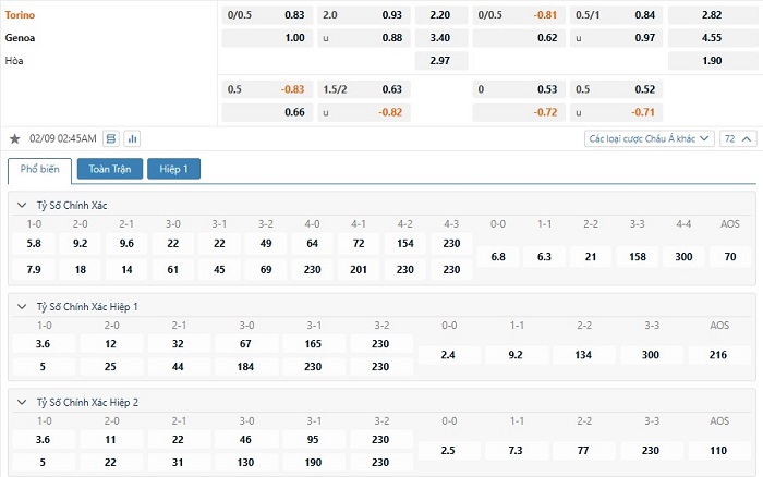 Bảng tỷ lệ kèo bóng đá trận đấu Torino vs Genoa