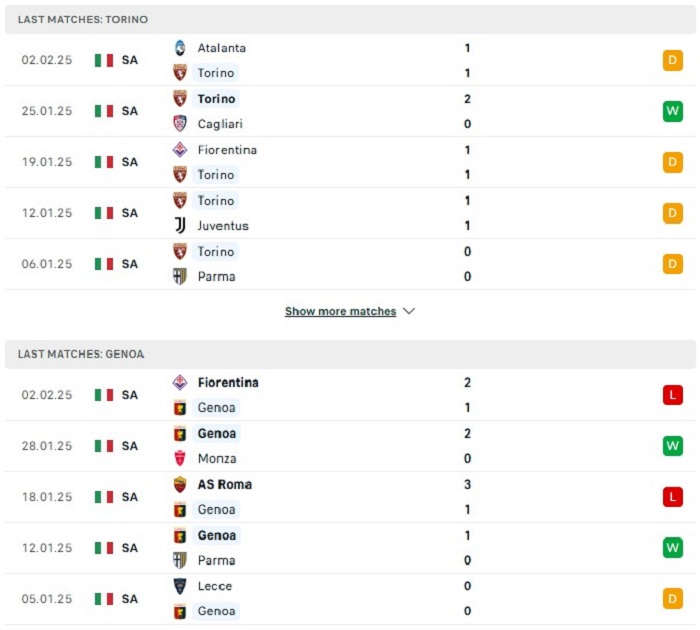 Phong độ gần đây Torino vs Genoa
