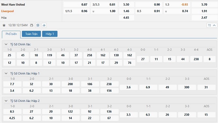 Bảng tỷ lệ kèo bóng đá trận đấu West Ham United vs Liverpool