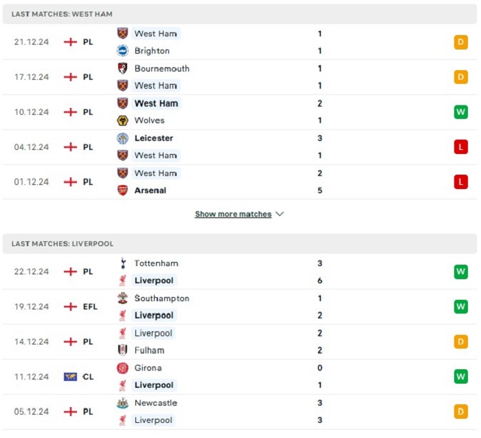 Phong độ gần đây West Ham United vs Liverpool