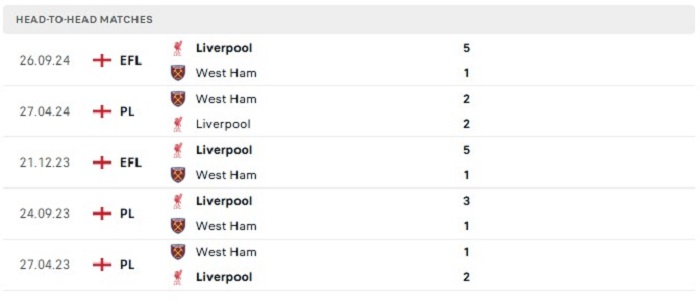 Lịch sử đối đầu của West Ham United vs Liverpool